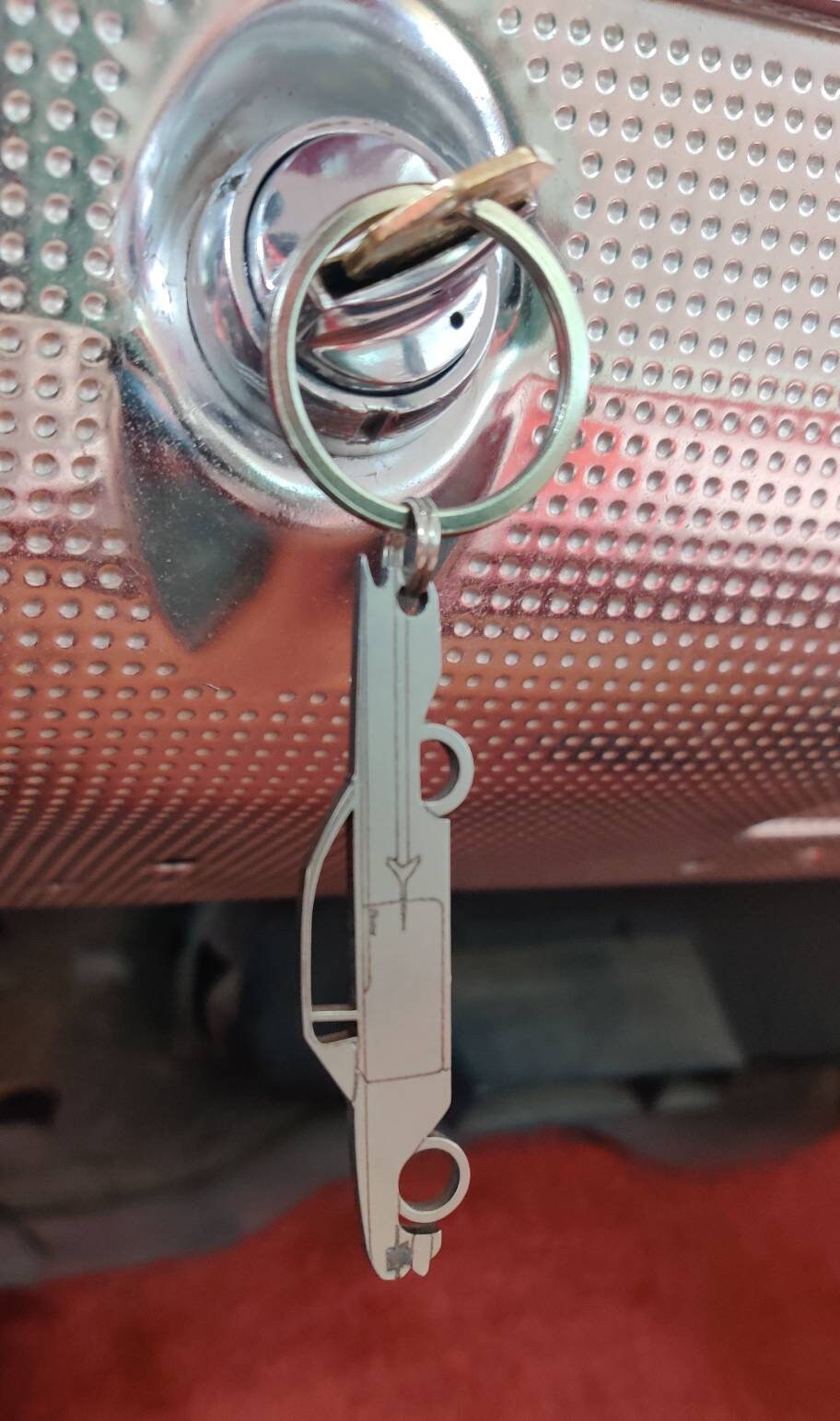 CNC laser cut from 12ga (0.105in) Stainless Steel. Tumble polished as a final finish. Comes with 1.25in key ring.