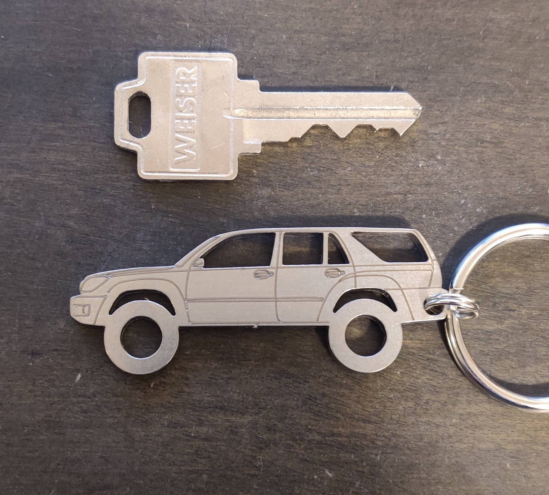CNC laser cut from 12ga (0.105in) Stainless Steel. Tumble polished as a final finish. Comes with 1.25in key ring.